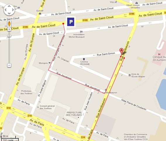 Si vous venez en auto, la rue est en sens unique et accessible par l’Avenue de Paris, ou par un parcours circulaire à partir de l’Avenue de Saint Cloud. Notez le stationnement payant dans ces rues, possibilité d’un parking souterrain à proximité.